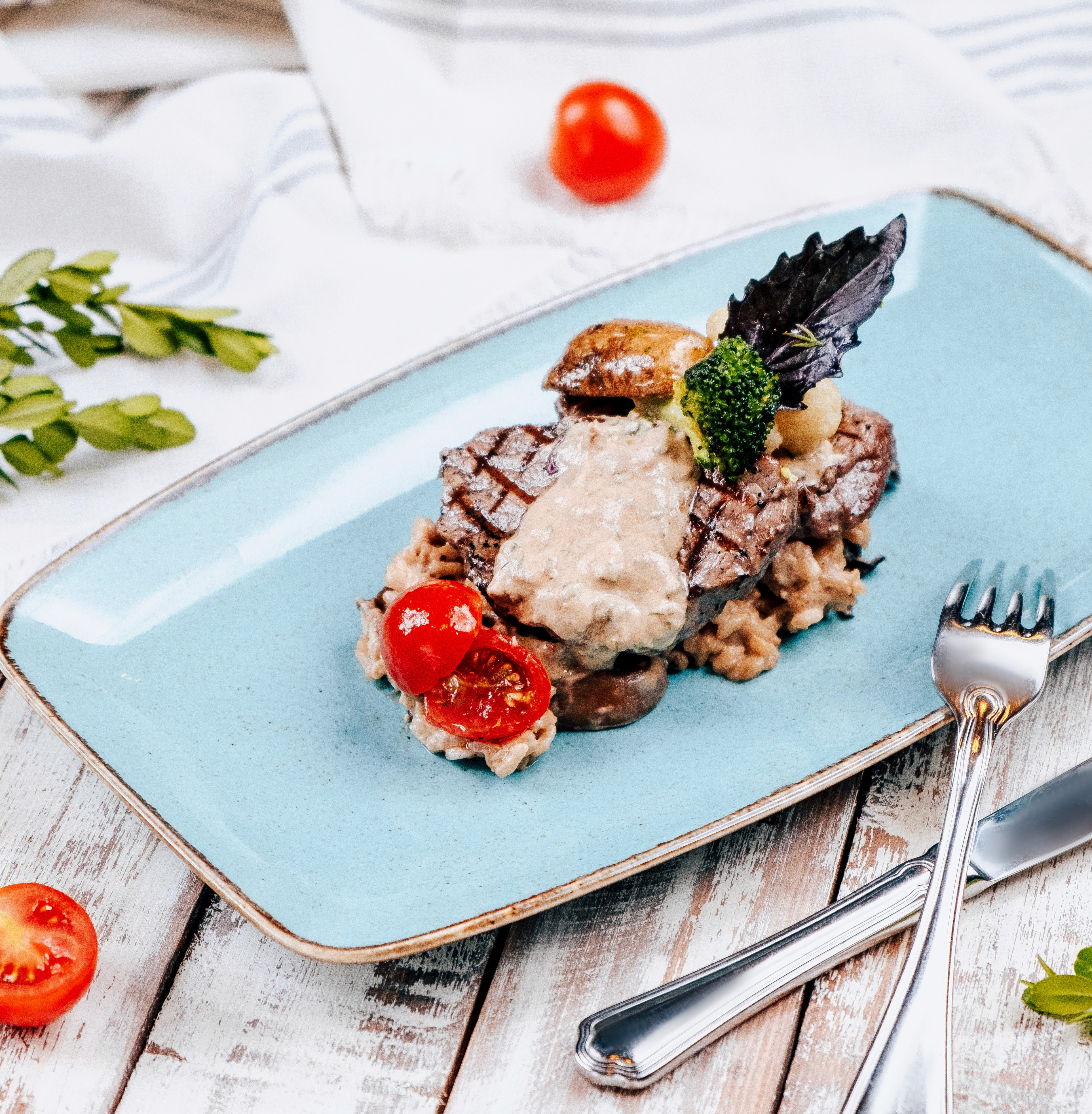 Steak with wild mushrooms served with today’s vegetables.