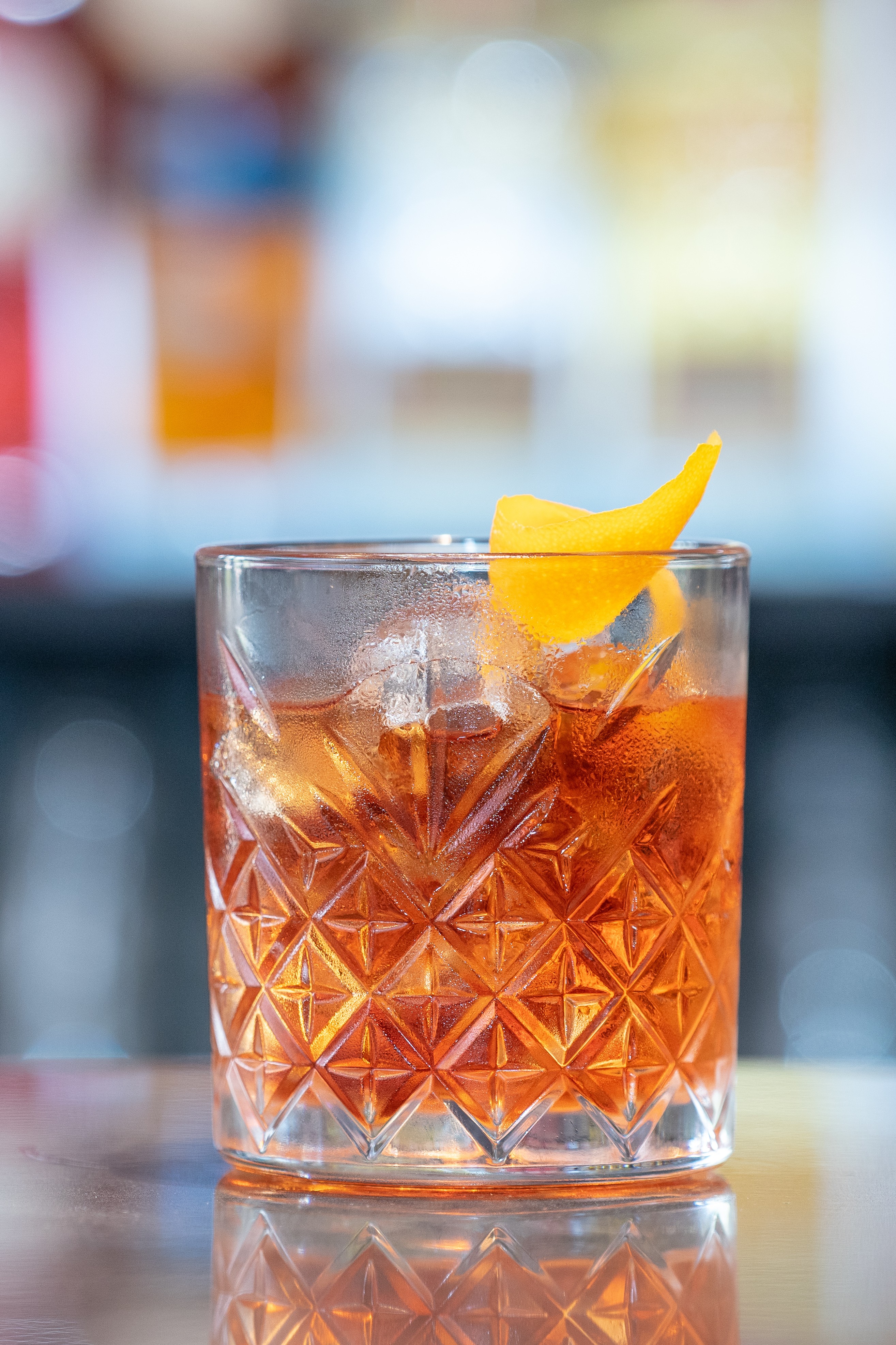 A timeless Italian aperitivo — gin, Campari and sweet vermouth stirred over ice. En tidløs italiensk aperitivo — gin, Campari og sød vermouth rørt over is.