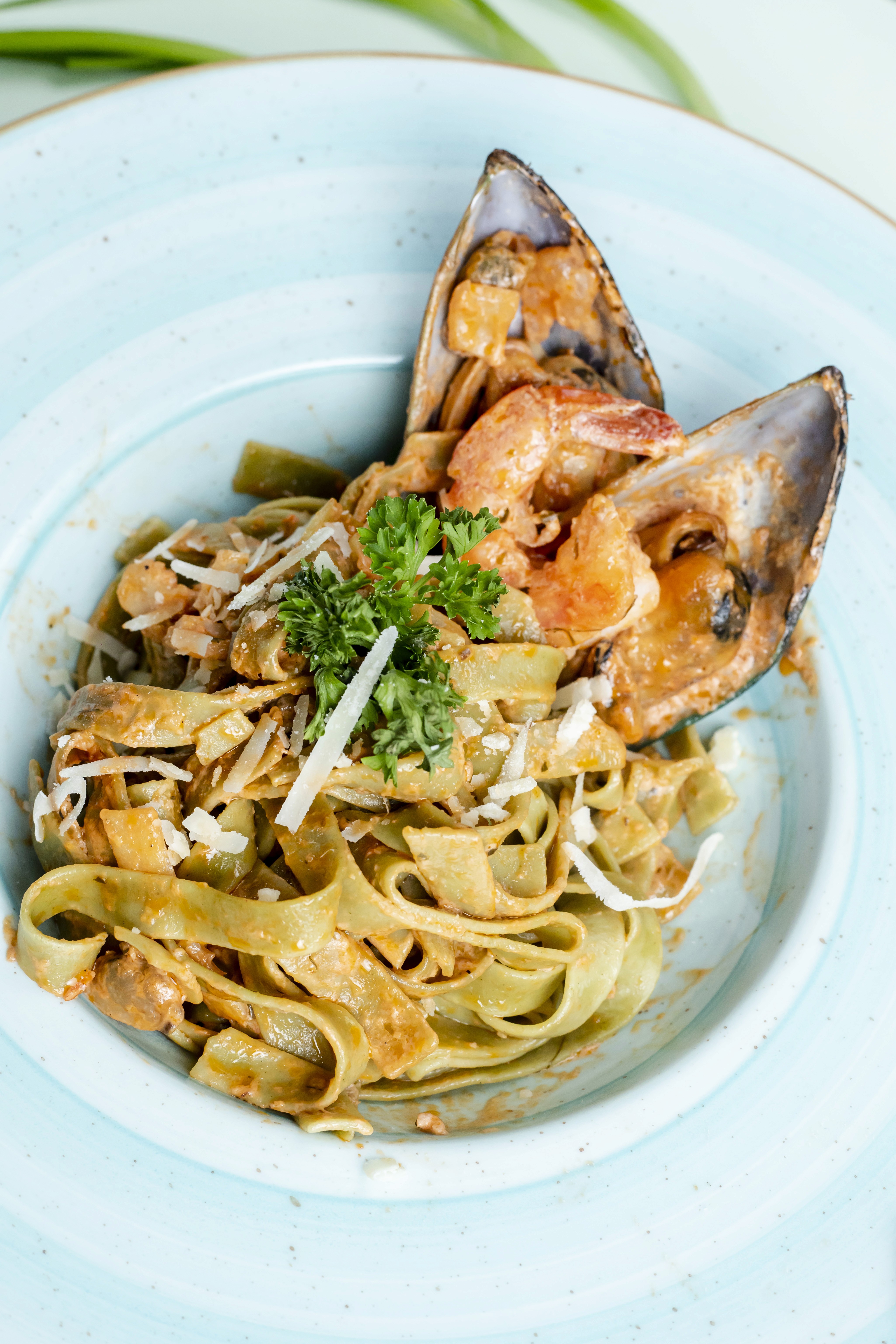 Spaghetti with seafood and white wine sauce.